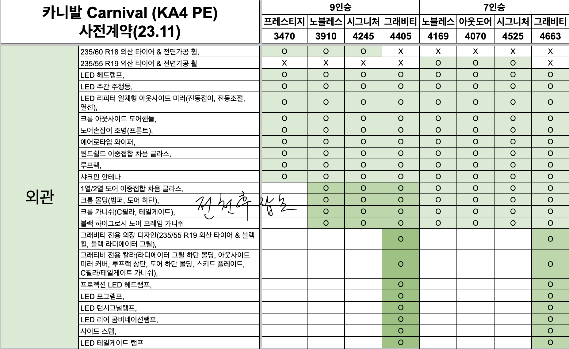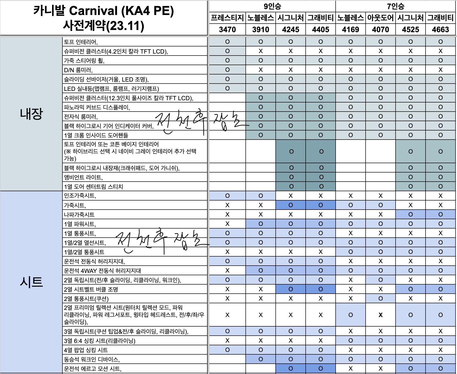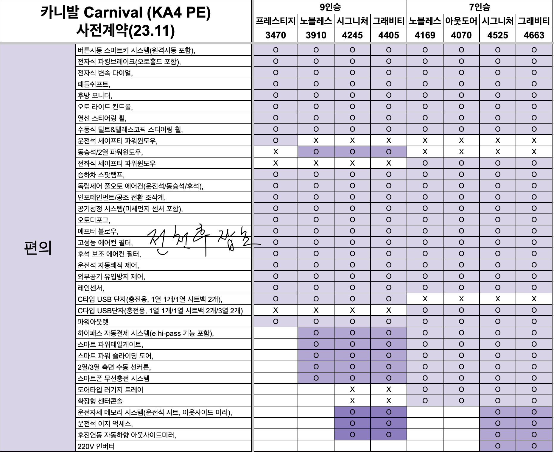 9인승 - 시그니처/그래비티 트림과 동일한 항목들이 추가적용됩니다.