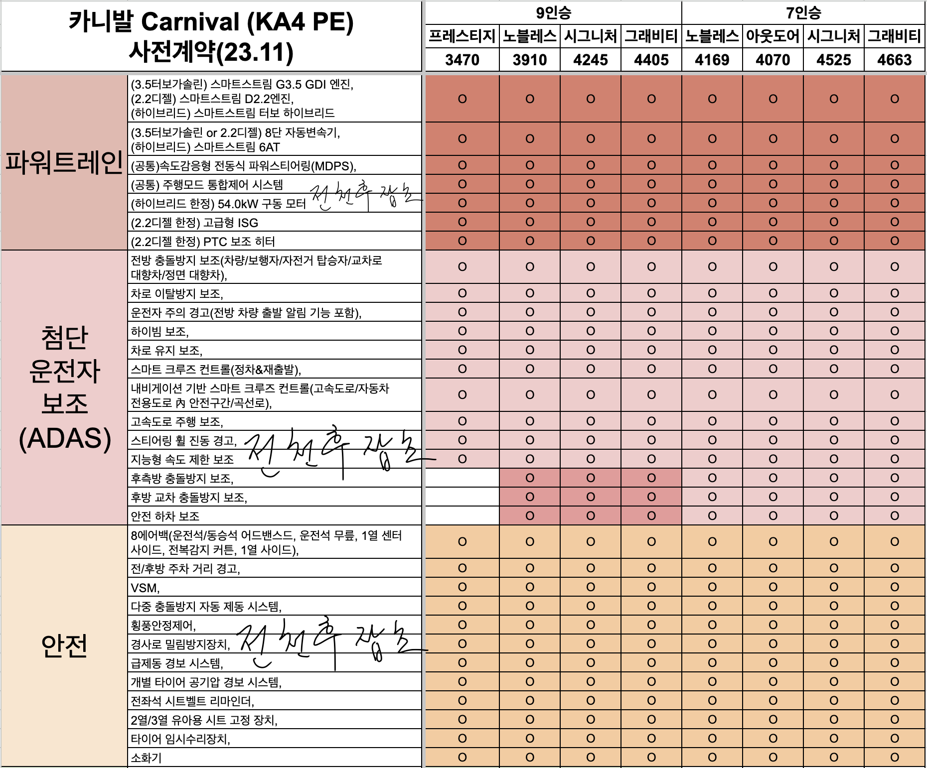 엔진은 전 트림에서 가솔린 / 디젤/ 하이브리드를 선택할수 있기 때문에 표의 최하단에 있는 공통품목으로 구분하였습니다.